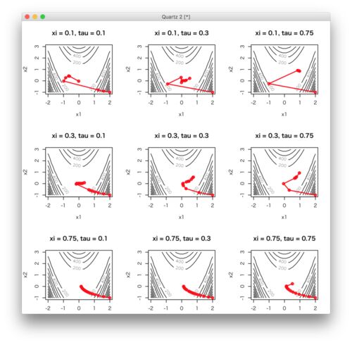 wikipedia:en:Rosenbrock_functionという有名らしい関数があるんですが、共役勾配法の動きを見てみるためにこの関数で遊んでみました。結果はこんな感じ。 極端すぎないパラメータだと大域的最適解に行ってくれました。コードも簡単。 f <- function(x) { x1 …