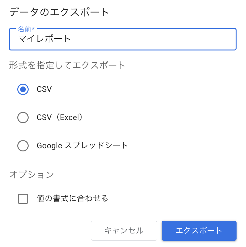 他人が作ったLooker Studioのレポートを見ていて「この可視化の結果と自分が持ってるデータ(例: 独自のカテゴリの分類)を突き合せて分析したいな」ということがたまにあると思います。レポートのオーナーにデータを出してもらうように依頼することもできますが、自分でエクスポートして分析に持ち込むことも可能です。やり方は簡単で、レポート内のグラフの右上に出る「その他」のボタンをクリックして「エクスポート」を押すと形式を選ぶダイアログが出てきます(詳細 / 解説)。CSVなりスプレッドシートなり、好きな形式でエクスポートして、煮るなり焼くなりできます。